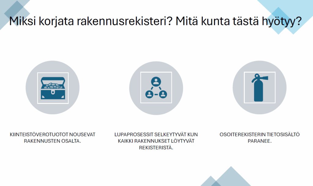 Yritys tarjoaa asiantuntijapalveluja monenlaisiin tarkoituksiin kunnille, yrittäjille sekä yksityisille. Tarjoamme kunnille rakennusrekisterin perusparannusta, jolla on suora vaikutus kiinteistöverotuottoihin kunnassa.